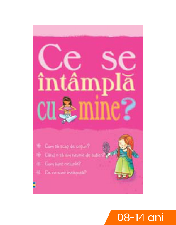Ce se intampla cu mine? (pentru fete) de Susan MeredithMaturizarea e mult mai uSoara daca Stii la ce sa te aStepti. Aceasta carte descrie exact ce se va intampla cu corpul tau, intr-un mod direct, uSor de inteles, Si iti explica Si unele dintre sentimentele tale tot ce trebuie sa Stii in aceasta perioada atat de importanta din viata ta.Cand o sa am nevoie de sutien?De ce sunt indispusa?
