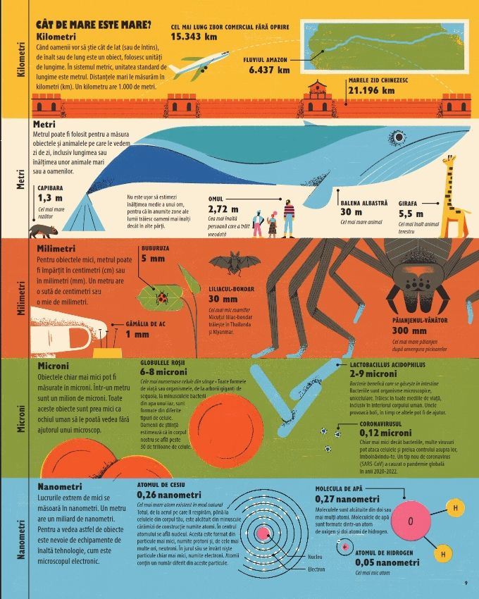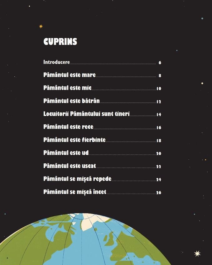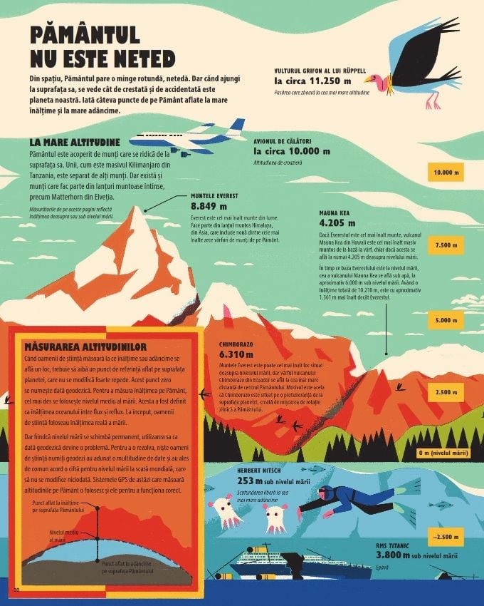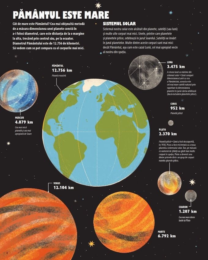 Pamantul este mare Comparatii uimitoare de Steve TomecekAfla cat de exceptionala este planeta Pamant din aceasta carte plina de comparatii uimitoare!Pamantul este MARE!(prin comparatie cu o broasca)Pamantul este MIC!(cand este ascuns in interiorul unei galaxii)Iar asta nu este tot. Pamantul este ud si uscat, fierbinte si rece, greu si usor, rotund si crestat, se misca repede si incet. Cred ca intelegi ce vreau sa spun. Totul depinde de punctul din care privesti lucrurile!Familiarizeaza-te cu planeta pe care locuim intr-un mod cu totul inedit, comparand-o cu o mare diversitate de lucruri – de la particule infime, la roiuri gigantice de stele. Stiai ca bulele de sapun se numara printre obiectele din Univers care sunt sfere perfecte? Sau ca pe planeta noastra numarul de gaini este mai mare decat cel al oamenilor? Sau ca in desertul cel mai arid de pe Pamant nu este o caldura insuportabila, ci un frig de crapa pietrele? Viziteaza cateva dintre cele mai interesante locuri extreme de pe planeta, priveste diferitele forme de viata, de la bacterii la elefanti si arborii sequoia, si exploreaza elementele care fac din Pamant casa noastra perfecta.Niciodata nu vei mai privi Pamantul in acelasi fel!