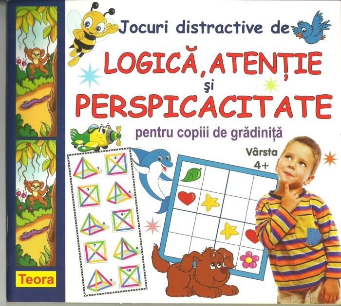 Jocuri distractive de logica, atentie si perspicacitate pentru copiii de gradinita 4+ de O culegere distractiva de jocuri care stimuleaza dezvoltarea intelectuala a prescolarilor!Jocurile incluse in carte dezvolta atentia, gandirea logica si perspicacitatea copiilor care sunt pusi in situatia de a cauta singuri solutiile unor probleme.Rezolvand testele din carte, copiii vor invata sa gandeasca abstract si vor gasi solutia cu satisfactie. incurajati-i si cultivati-le capacitatea de a gandi!Vor deveni cu siguranta mai isteti, mai atenti si mai pregatiti pentru scoala!