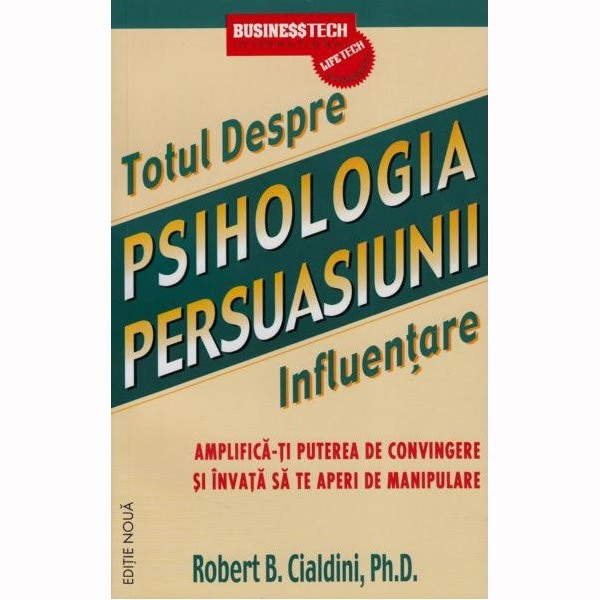 Psihologia persuasiunii Totul despre influentare. Amplifica-ti puterea de convingere si invata sa te aperi de manipulare de Robert B. CialdiniPsihologia persuasiunii si-a capatat locul de cea mai importanta carte publicata vreodata despre acest subiect datorita valorii practice a informatiilor oferite. In cuprinsul ei, distinsul psiholog Robert B. Cialdini, doctor in filosofie, explica de ce unii oameni sunt remarcabili de convingatori si cum putem sa-i convingem cu propriile noastre arme.Veti afla cele sase secrete psihologice care se afla in spatele impulsului nostru puternic de a ne supune, cum pot fi ele folosite de persoane iscusite fara a fi detectate, cum sa ne aparam impotriva lor si cum sa punem la lucru acele secrete in folosul propriu.Aceasta carte indispensabila iti garanteaza doua lucruri: niciodata nu te vei mai simti obligat sa spui "da", cand de fapt gandesti ca ar fi in interesul tau sa spui "nu" si cu siguranta vei avea mai multa influenta decat ai avut vreodata.Doctorul in filozofie Robert B. Cialdini sustine cursuri universitare si post-universitare despre persuasiune si influenta sociala la University of North Carolina si Columbia Univeristy. El este in prezent seful catedrei de psihologie si membru al Consiliului de Conducere al Arizona State University.
