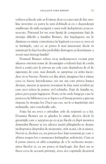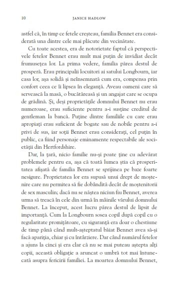 Cealalta sora Bennet de Janice Hadlow"Fanii lui Jane Austen sunt incantati... O poveste exceptionala, o adevarata incantare!"Helen Simonson, autoarea romanelor bestseller New York Times,Major Pettigrew's Last Stand si The Summer Before the War"O noua versiune captivanta a unei lumi familiare. Vei fi innebunit sa afli daca lui Mary, la urma urmei, i se va permite – sau isi va permite – un final fericit."Jo Baker, The Guardian"Daca ai crezut ca Mary, sora tocilara din Mandrie si prejudecata, a fost prea plictisitoare pentru a-si justifica propriul roman, mai gandeste-te o data: in cartea lui Janice Hadlow, sora fara viitor primeste in sfarsit putin respect - si poate chiar iubire.O, The Oprah Magazine"Absolut magic! Este o minune ca Cealalta sora Bennet este primul roman al lui Janice Hadlow. Scrisul ei este elegant si ironic, iar povestea este captivanta... Veti fi surprinsi ca nu o cititi, de fapt, pe Jane Austen."BookPage"Cealalta sora Bennet este o lectura fascinanta, prietenoasa si reconfortanta – perfecta intr-o noapte de iarna."The Sun