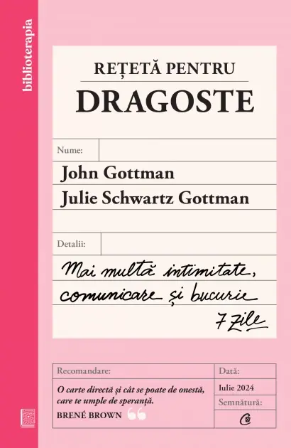 Rețetă pentru dragoste de JOHN GOTTMAN, JULIE SCHWARTZ GOTTMANBazându-se pe decenii de cercetare și analiză a relațiilor de cuplu, John și Julie Gottman adună în Rețetă pentru dragoste cele mai puternice ingrediente menite să vă consolideze relația. De-a lungul a șapte zile, veți învăța să vă dozați eficient grija și afecțiunea și să renunțați la tot ce dăunează sănătății cuplului: critica, disprețul, atitudinea defensivă și refuzul comunicării.