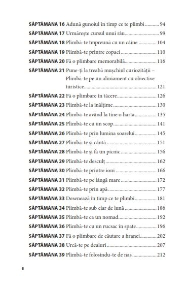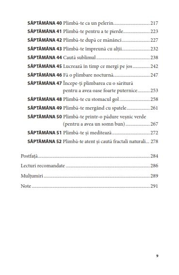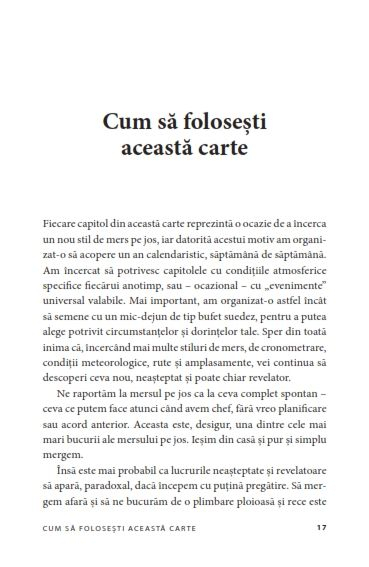 52 de stiluri pentru mersul pe jos de Annabel StreetsCredem ca stim sa mergem. La urma urmei, mersul pe jos este una dintre primele abilitati pe care le invatam. Dar multi dintre noi suntem blocati in rutinele noastre de deplasare, mergand mereu in acelasi loc, in acelasi mod, cu aceiasi oameni. Propunand o rutina de plimbare saptamanala care iti va da de gandit si fiind sustinuta de dovezi, cartea 52 de stiluri pentru mersul pe jos te ajuta sa-ti imbunatatesti stilul de deplasare, incurajandu-te totodata sa cauti noi locuri (multe in apropierea ta), noi tovarasi de drum (creierul nostru functioneaza mai bine atunci cand avem alaturi noi companioni), momente noi ale zilei si ale noptii si noi abilitati de dobandit in timpul mersului.Inspirationala, sustinuta de stiinta, presarata cu anecdote si sfaturi practice, aceasta carte te va motiva, provoca, sustine si incuraja sa adopti un stil de deplasare cat mai bun. In paginile ei dezvaluie modul in care mersul pe jos poate fi cel mai bine pastrat... secret al oamenilor extrem de sanatosi si fericiti, creativi si care au un somn odihnitor – persoanele cu cea mai buna postura si cele mai vii amintiri. Aproape totul, se pare, poate fi imbunatatit si dezvoltat printr-un stil de mers inteligent si corect. Astfel, se dovedeste ca de fapt poti obtine mai mult din viata, pas cu pas.