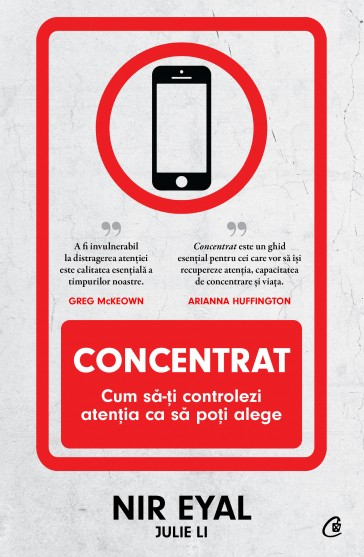 Concentrat Cum sa-ti controlezi atentia ca sa poti alege de Nir Eyal , Julie LiTraim intr-o lume in care telefonul mobil a devenit o extensie a trupului, in care suntem coplesiti de avalanse de informatii mai mult sau mai putin utile, in care nu mai stim cum sa ne facem timp pentru noi insine si pentru lucrurile cu adevarat importante din vietile noastre. Pierdem din vedere esentialul si nu mai avem rabdare sa ducem la bun sfarsit o sarcina fara sa ne lasam distrasi de tot felul de stimuli exteriori.In Concentrat, NIR EYAL si JULIE LI abordeaza problemele omului modern in ceea ce priveste controlul timpului si vin cu solutiile potrivite pentru a riposta la tendinta dominanta si a tine la distanta tentatiile acaparatoare. Daca esti unul dintre cei carora nu le ajunge niciodata timpul si daca vrei sa iti canalizezi atentia doar spre ceea ce merita, ai ocazia sa descoperi cateva strategii al caror efect se va face simtit imediat ce le vei pune in practica