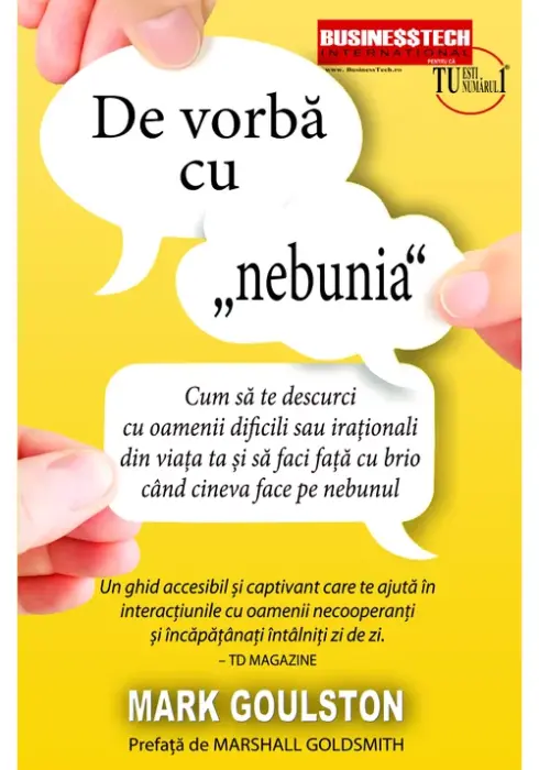De vorba cu "nebunia" de Mark Goulston”Sa recunoastem, cu totii avem in preajma oameni care sunt dificili sau irationali. Si indiferent cat de mult ai incerca sa argumentezi cu ei, mai mult te enervezi. Deci care este solutia? Cum vorbesti cu cineva care este scapat de sub control? Ce poti face cu un sef care are pretentii aberante, cu un coleg de serviciu manipulator sau cu o persoana excesiv de emotionala care izbucneste frecvent in lacrimi? Cum te descurci cu adolescentul tau ostil, cu un sot care explodeaza din nimic ori cu un parinte varstnic, vulnerabil? Cum tratezi un vecin conflictual, sau un client absurd?