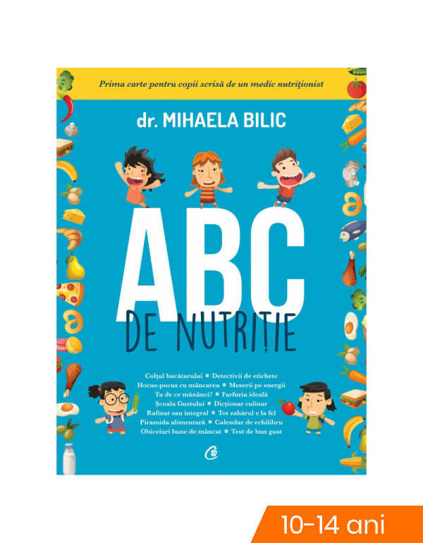 ABC de nutritie de Dr. Mihaela BilicPrima carte pentru copii scrisa de un medic nutritionist ABECEDAR DE NUTRITIE PENTRU OAMENI MICI SI MARI Coltul bucataruluiDetectivii de etichete Hocus-pocus cu mancareaMeserii pe energii Tu de ce mananci?Farfuria ideala Scoala GustuluiDictionar culinar Rafinat sau integralTot zaharul e la fel Piramida alimentaraCalendar de echilibru Obiceiuri bune de mancatTest de bun gust Relatia unui copil cu mancarea se construieste in copilarie. Atunci invata ce inseamna foamea si pofta, descopera placerea de a manca, incepe sa-si recunoasca nevoile corpului, sa stie ce rol au alimentele. Dar un copil nu poate sa-si construiasca singur o dieta diversificata si echilibrata, nu stie sa se protejeze de supraoferta alimentara, nu reuseste sa identifice corect produsele. Pentru asta are nevoie de familie, de educatie, de scoala, de informatie, de carti si de un abecedar de nutritie! dr. Mihaela Bilic, medic nutritionist Vrei sa fii bine crescut? Atunci trebuie sa fii bine hranit! Descopera singur adevarul despre alimente, afla care este rolul lor in organism, ce si cat trebuie sa mananci. Gustul se educa si se antreneaza din copilarie. Intra la Scoala Gustului si invata sa faci din mancare un prieten. E mai distractiv si mult mai interesant decat la orice alta scoala, pentru ca are gust bun! Joaca-te, experimenteaza, afla, nutritia este acum pe intelesul tau. Ai la dispozitie 30 de jocuri si experiente legate de mancare, 30 de curiozitati si secrete despre alimente, teste si exercitii de istetime, liste de echivalente, explicatii medicale si informatii stiintifice, tabele si grafice cu procente de nutrienti, o istorie cu gust si o diploma de absolvire. Totul cuprins intr-o carte scrisa pentru tine, simpla, colorata si frumos ilustrata. Incepand de astazi vei sti totul despre mancare!