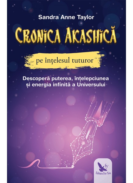 CRONICA AKASHICA PE INTELESUL TUTUROR de Taylor Sandra AnneCronica Akashica este o biblioteca spirituala plina de informatii despre lume si tot ce se afla in ea: fiecare persoana si eveniment, trecute si prezente. Accesarea inregistrarilor ne ajuta sa vindecam trecutul, sa trecem de provocarile din viata prezenta, sa rezolvam blocajele si sa raspundem la intrebari despre viitor. Sandra Anne Taylor, maestra spirituala renumita la nivel international, iti ofera acest ghid introductiv intr-o fascinanta filosofie si iti arata:• ce contine Cronica Akashica si cum s-o accesezi• cum sa calatoresti prin eternitate pentru a investiga trecutul, prezentul si viitorul potential• cum te influenteaza azi vietile trecute si ce sa faci pentru a rescrie inregistrarile defavorabile• cum sa folosesti Cronica pentru a-ti gasi scopul, a-ti extinde talentele si a gasi mai mult succes si bucurie in aceasta viata• cum sa programezi evenimente viitoare in inregistrarile acestei vieti si in cele urmatoare