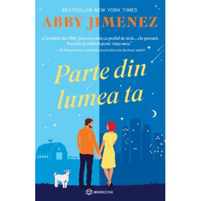 Parte din lumea ta de Abby JimenezAlexis Montgomery este o femeie de succes, obisnuita cu viata sofisticata a unui oras mare si aglomerat. Insa totul se schimba atunci cand il intalneste pe Daniel Grant, un barbat cu zece ani mai tanar decat ea, modest, cu o atitudine relaxata si deosebit de atragator. Desi provin din lumi total diferite, chimia dintre ei este de necontestat.