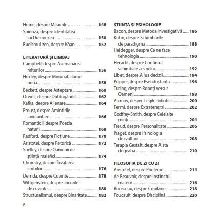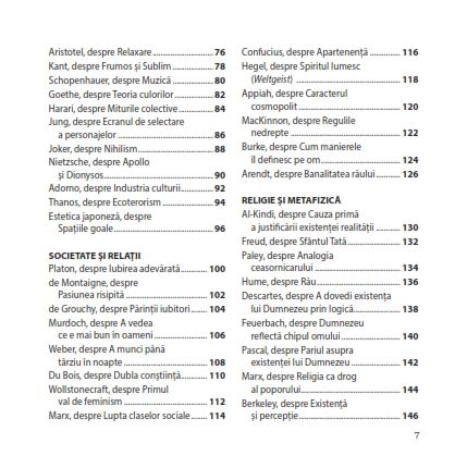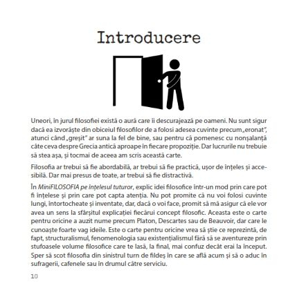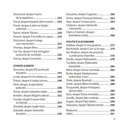 miniFILOSOFIA pe intelesul tuturor. Cartea mica a ideilor mari de Jonny ThomsonminiFILOSOFIA pe intelesul tuturor este o calatorie fascinanta printre raspunsurile pe care le-au dat unele dintre cele mai luminate minti din ultimii 2500 de ani la marile intrebari ale vietii si motivele pentru care acestea sunt relevante pentru noi chiar si astazi.Abordand toate temele, de la strategia lui Sun Tzu pe care o putem aplica in jocurile de societate, pana la perspectiva lui Freud despre "impulsul nostru catre moarte"; de la motivul pentru care Simone de Beauvoir credea ca instinctul matern este un mit, pana la de ce Schopenhauer nu era prea amuzant la petreceri, aceste mini-meditatii scot filosofia din turnul sau de fildes, ajutandu-te astfel sa-ti dezvolti mintea si sa-ti largesti viziunea.Traducere: Maria Tudose