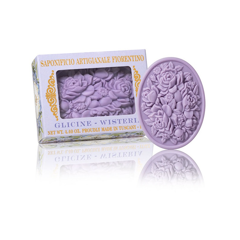 În colecția Botticelli regăsim o adevărată grădină a desfătărilor. Produse în Italia din uleiuri vegetale de cea mai bună calitate și extracte naturale, săpunurile Botticelli ne invită la un joc de lumină și culori. Produsele curăță în profunzime pielea, îi asigură o hidratare intensă și o catifelează. De culoare mov și formă ovală, săpunul Glicine încântă nu numai prin aroma floarală, ci și gravura deosebită de flori. Cu un ambalaj elegant, este cadoul ideal pentru persoanele care apreciază calitatea. Nu conține chimicale. Gramaj 125 g. Distribuit de: LIBRARUL BOOKS TOYS & GIFTS srl, str. Bahluiului nr 1, București; tel 021 222 8380.