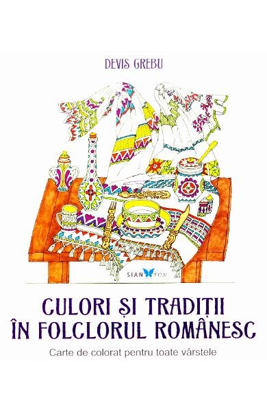 Culori si traditii in folclorul romanesc  de Devis GrebuCulori si traditii in folclorul romanesc. Carte de colorat pentru toate varsteleRenumitul pictor si ilustrator Devis Grebu surprinde si interpreteaza intr-un mod original, dupa o documentare ca la carte, cele mai importante traditii, decoruri si obiceiuri din folclorul romanesc. Aceste firesti tablouri rustice asteapta, mai mult sau mai putin cuminti, culorile care sa le insufleteasca si sa le transforme in opere de arta personalizate, pe gustul vostru.Veti aprecia, fara indoiala, faptul ca nu ne-am multumit sa copiem proiecte de succes de peste mari si tari, ci ne-am straduit sa adunam in aceasta carte desene onginale, inspirate, pline de umor si, totodata, reprezentative pentru folclorul autentic.