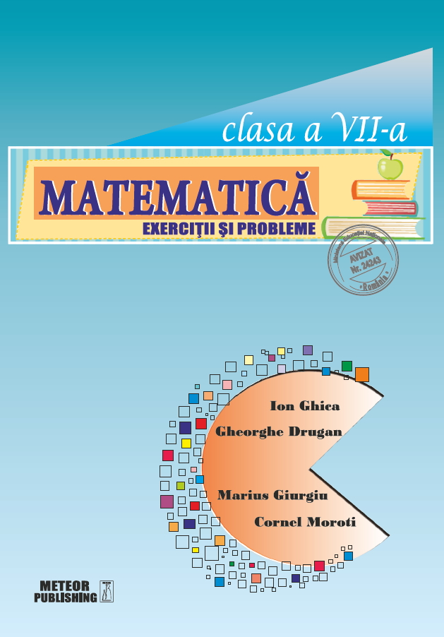 Matematica. Exercitii si probleme. Clasa a VII-a de Ion Ghica, Gheorghe Drugan, Marius Giurgiu, Cornel MorotiCulegerea de exercitii si probleme de matematica pentru clasa a VII-a este structurata in conformitate cu programa scolara, fiind un instrument de lucru care ii ajuta pe elevi sa-si aprofundeze cunostintele printr-o activitate individuala.Capitolele cartii contin o prezentare initiala a notiunilor teoretice de baza, pentru intelegerea cat mai buna si sistematizarea continutului. Fiecare capitol se incheie cu exercitii si probleme recapitulative prin teste.Prin diversitatea exercitiilor si problemelor, care sunt ordonate si prezentate gradat, pe trei niveluri de dificultate, precum si prin solutiile detaliate, se urmareste consolidarea materiei continute in programa scolara si dobandirea unor deprinderi de rezolvare in vederea sustinerii cu succes a evaluarilor si examenelor.