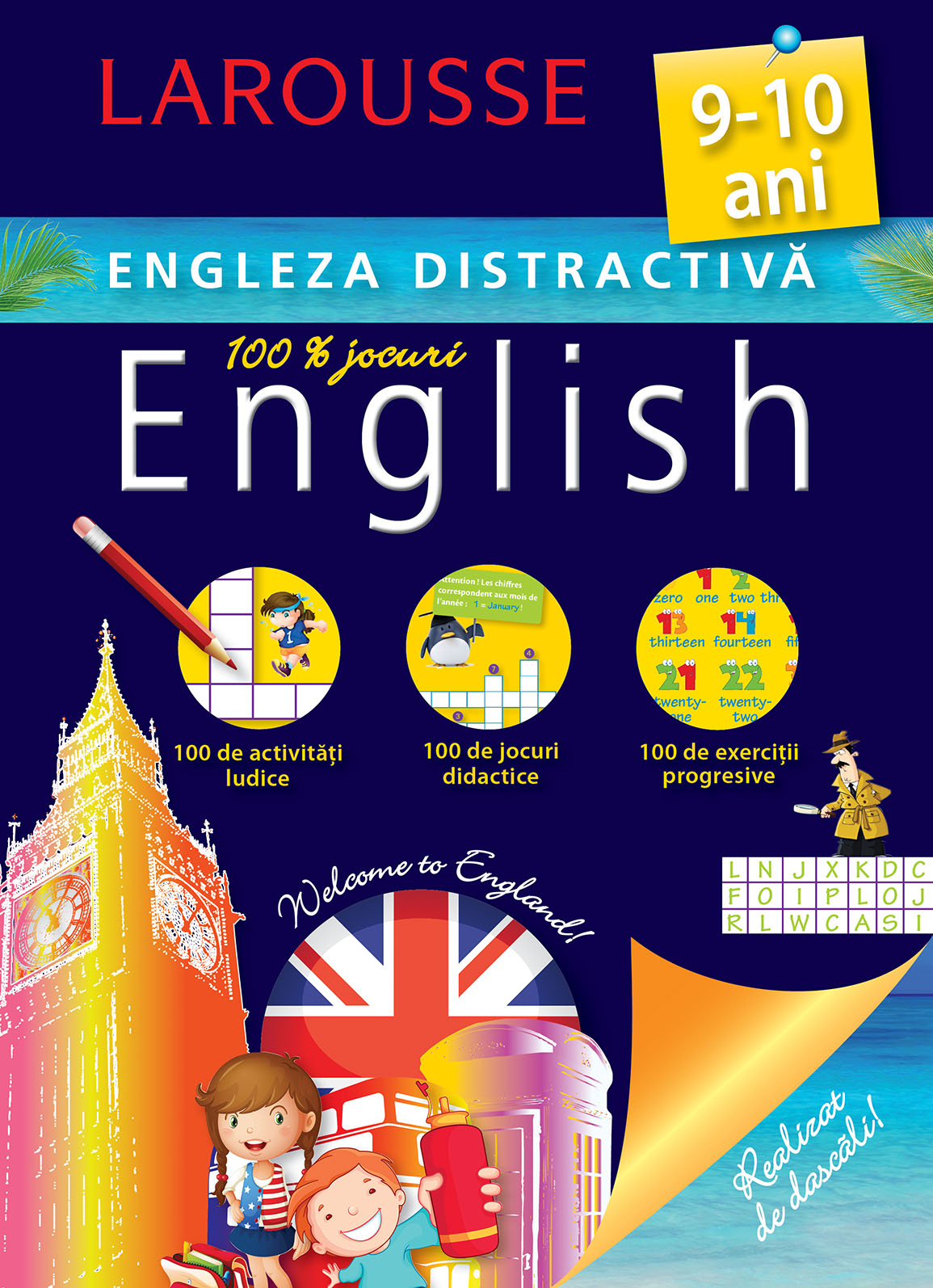 Larousse. Engleza distractiva 9-10 ani de LarousseCartea este conceputa de specialistii Larousse pentru copiii de 9-10 ani care studiaza limba engleza.Contine activitati ludice, jocuri didactice, exercitii progresive.- Activitati adaptate si jocuri care te vor ajuta sa te antrenezi si sa progresezi- Toate cuvintele pe care ar trebui sa le cunosti- Siretlicuri ca sa treci drept un englez- Informatii culturale- Scurta recapitulare a notiunilor de gramatica- Raspunsuri amanuntite- Minilexicon englez-romanCu metoda Larousse, invatarea limbii engleze este un joc de copii!
