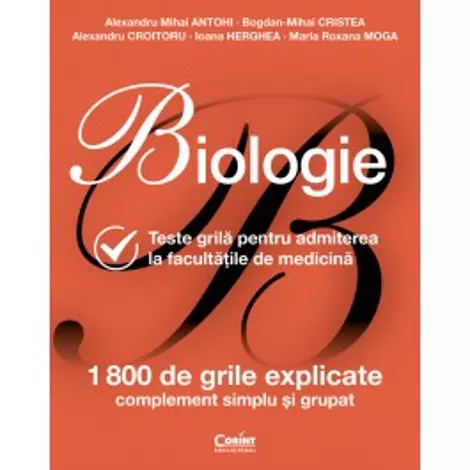 Biologie. Teste grila pentru admiterea la facultatile de medicina de Alexandru CROITORU, Alexandru Mihai ANTOHI, Bogdan Mihai CRISTEA, Ioana HERGHEA, Maria Roxana MOGALucrarea este structurată în două părți – prima parte evaluează, prin intermediul a 15 teste, conținutul manualului din perspectiva însușirii propriu-zise a noțiunilor prezentate, în timp ce partea a doua cuprinde 15 teste cu grad crescut de dificultate, unde elevul care se pregătește să devină student la medicină trebuie să dovedească o bună capacitate de corelare a noțiunilor studiate în cadrul diferitelor capitole de anatomie și fiziologie a omului, cuprinse în manualul-bibliografie pentru examen.