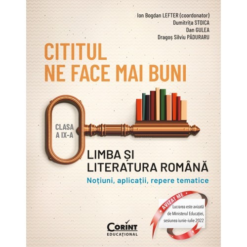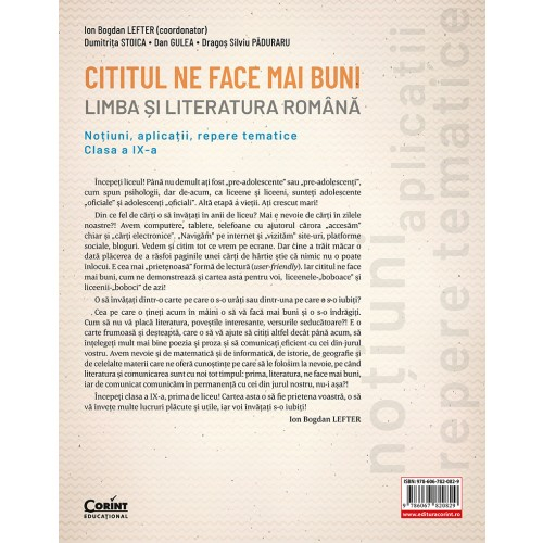 Cititul ne face mai buni Limba si literatura romana. Notiuni, aplicatii, repere tematice. Clasa a IX-a de Ion Bogdan Lefter, Dumitrita Stoica, Dan Gulea, Dragos Silviu PaduraruLucrarea este realizata in conformitate cu actuala programa scolara de limba si literatura romana. In plus, tine cont de reperele metodologice publicate de Centrul National de Politici si Evaluare in Educatie, in scopul armonizarii programei de liceu cu aceea de gimnaziu.Problemele de literatura, limba si comunicare au fost abordate integrat si preponderent aplicativ in cinci unitati tematice: U 1 – Adolescenta, U 2 – Scoala, U 3 – Iubirea, U 4 – Lumi fantastice, U 5 – Confruntari etice. Exista, de asemenea, la sfarsitul fiecareia dintre unitati texte, sugestii de lectura si exercitii pentru temele alternative (programa prevede obligativitatea studierii a cinci teme din zece). Intrucat majoritatea textelor literare alese dezvolta o tematica bogata, lucrarea ofera posibilitatea abordarii variate la acest nivel, permitand orice alegere a temelor si o organizare a demersului didactic fie urmand structura cartii, fie construind una noua cu ajutorul secventelor ei.Pe langa sintezele informative si explicative, include a numeroase si diverse exercitii cu rolul fixarii unor concepte, al intelegerii textelor si problemelor. In plus, activitatile de invatare propun deschideri frecvente catre realitatea in care traim, cu accentul pe ceea ce este esential, benefic in formarea unui tanar si pe valorile civice.La final, se ofera sugestii de rezolvare pentru unele dintre exercitiile propuse.