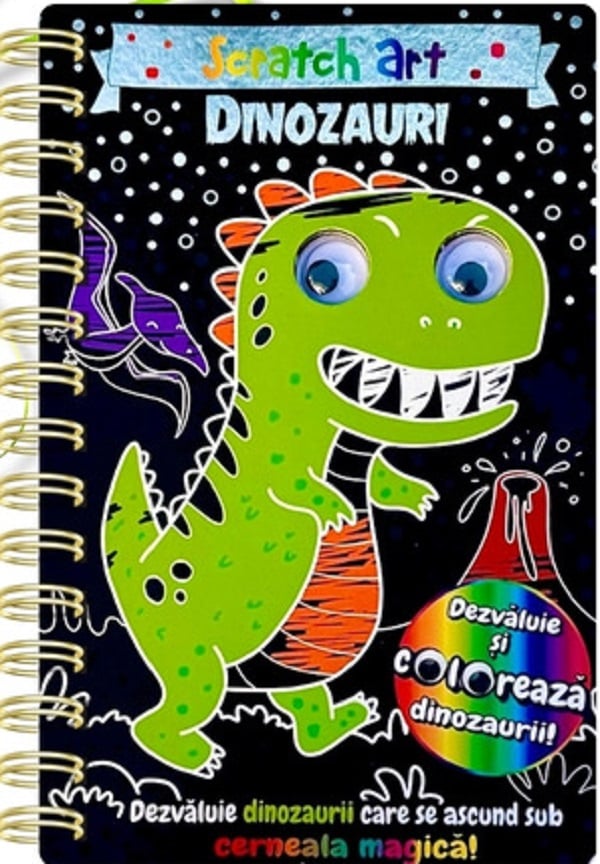 Dinozauri. Scratch ArtDescopera dinozaurii care se ascund in paginile acestei carti. Razuiti cerneala magica cu racleta de lemn si veti fi surprinsi de efectele fantastice de culoare care ies la iveala. Apoi, luati cele mai colorate creioane pentru a da viata personajelor din poveste!