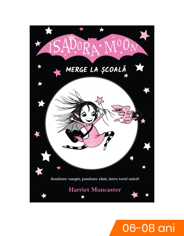 Isadora Moon merge la scoala de Harriet Muncaster Varsta recomandata 6-8 ani. Mama ei este zana, tatal este vampir, iar ea este cate putin din amandoua!Indrageste noaptea, liliecii si costumul negru de balet, dar si soarele stralucitor, bagheta magica si il adora pe Iepurasul Roz.Cand vine vremea ca Isadora sa mearga la scoala, inca nu stie ce i se potriveste. Sa fie scoala de vampiri sau cea de zane?Aceasta sunt eu, Harriet Muncaster! Sunt autoarea si ilustratoarea cartii despre Isadora Moon. Da, chiar asa! Imi place orice e dragalas, orice e stralucitor si oricine este un visator.