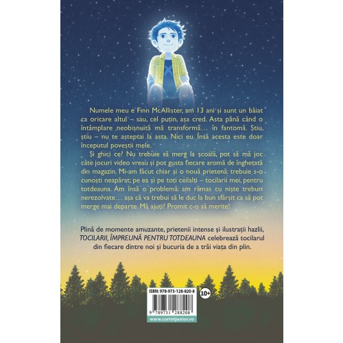 Tocilarii, impreuna pentru totdeauna de James Patterson, Chris GrabensteinNumele meu e Finn McAllister, am 13 ani si sunt un baiat ca oricare altul – sau, cel putin, asa cred. Asta pana cand o intamplare neobisnuita ma transforma… in fantoma. Stiu, stiu – nu te asteptai la asta. Nici eu. Insa acesta este doar inceputul povestii mele.Si ghici ce? Nu trebuie sa merg la scoala, pot sa ma joc ore intregi pe calculator si pot gusta fiecare aroma de inghetata din magazin. Mi-am facut chiar si o noua prietena: trebuie s-o cunosti neaparat; pe ea si pe toti ceilalti – tocilarii mei, pentru totdeauna.Am insa o problema: am ramas cu niste treburi nerezolvate… asa ca va trebui sa le duc la bun sfarsit ca sa pot merge mai departe. Ma ajuti? Promit c-o sa merite!Plina de momente amuzante, prietenii intense si ilustratii hazlii, TOCILARII, IMPREUNA PENTRU TOTDEAUNA celebreaza tocilarul din fiecare dintre noi si bucuria de a trai viata din plin. "O scriitura in care comedia se impleteste armonios cu introspectia si cu ilustratiile care aduc un plus de umor. Cititorii vor fi recompensati de acest mix pana la ultima pagina!" Booklist"Patterson si Grabenstein raspandesc tendinte subtile de veselie si doze de optimism, in timp ce noii prieteni profita la maximum de starea lor spectrala si confrunta necunoscutul." Publishers Weekly