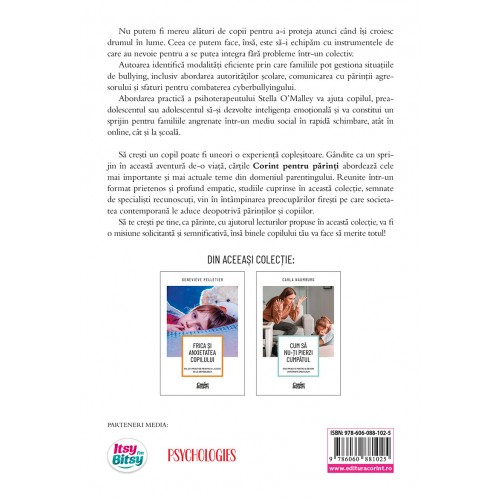 Copii mai puternici decat bullyingul Cum sa cresti un copil increzator, echilibrat si puternic de Stella O'MalleyNu putem fi mereu alaturi de copii pentru a-i proteja atunci cand isi croiesc drumul in lume. Ceea ce putem face, insa, este sa-i echipam cu instrumentele de care au nevoie pentru a se putea integra fara probleme intr-un colectiv. Autoarea identifica modalitati eficiente prin care familiile pot gestiona situatiile de bullying, inclusiv abordarea autoritatilor scolare, comunicarea cu parintii agresorului si sfaturi pentru combaterea cyberbullyingului.Abordarea practica a psihoterapeutului Stella O'Malley va ajuta copilul, preadolescentul sau adolescentul sa-si dezvolte inteligenta emotionala si va constitui un sprijin pentru familiile angrenate intr-un mediu social in rapida schimbare, atat in online, cat si la scoala."Pentru parinti, ingrijitori, rudele implicate, lucratori in centrele de ingrijire a copiilor, profesori, angajati in domeniul educatiei sau al sanatatii, cartea de fata este o lectura obligatorie." Organizatia irlandeza a Surorilor Medicale si a Moaselor"Copii mai puternici decat bullyingul este o lectura obligatorie pentru fiecare parinte preocupat de bunastarea emotionala a copilului sau. Stella O'Malley nu analizeaza doar emotiile pe care copilul le traieste in momente de dificultate, ci si pe cele ale parintilor. Aceasta carte este menita sa devina un manual pentru parintii ai caror copii sunt victime ale excluziunii sociale si ale bullyingului." MARY O'KANE, Coordonatoarea programului Primii ani, din Irlanda"Stella O'Malley evita jargonul si recurge la studii de caz intuitive pentru a analiza fenomenul de bullying." Irish Times