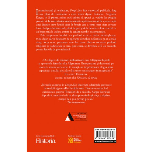 Draga Zari. Povesti nespuse ale unor femei din Afganistan de Zarghuna KargarImpresionanta si revelatoare, cartea face cunoscuta publicului larg viata plina de vicisitudini a unor femei afgane. Autoarea le da pentru prima oara prilejul sa spuna cu vorbele lor propria poveste: de la foarte tanara mireasa oferita ca plata cu scopul de a pune capat unei dispute intre familii pana la femeia care a tesut toata viata covoare intr-o incapere intunecoasa, plina de praf si de la fata care a fost crescuta ca un baiat pana la vaduva evitata de ceilalti membri ai comunitatii.Cele treisprezece istorisiri cu profund caracter intim, induiosatoare, triste chiar, dar si datatoare de speranta dezvaluie suferintele si, in acelasi timp, forta unor personaje care fac parte dintr-o societate profund religioasa si traditionala si care, prin curaj, se dovedesc a fi un exemplu pentru femeile de pretutindeni."O culegere de marturii tulburatoare care infatiseaza luptele si sperantele femeilor din Afganistan. Emotionanta si dureroasa pe alocuri, aceasta carte este, in esenta, un impresionant elogiu adus capacitatii omului de a face fata unor constrangeri inimaginabile." Khaled Husseini, autorul romanului Vanatorii de zmeie"Povestile cuprinse in Draga Zari ilustreaza suferintele provocate de traditii afgane adanc inradacinate. Din ele transpar insa cutezanta si puterea [femeilor] de a nu ceda. Kargar dezvaluie faptul ca, ascultandu-le pe altele povestindu-si viata, a capatat curajul de a si-o povesti pe a ei." The Independent