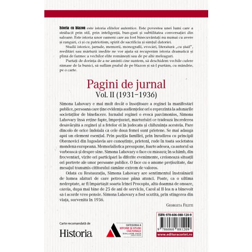 Pagini De Jurnal Vol. Ii (1931-1936) de Simona LahovaryVolumul contine Jurnalul din anii 1931–1936, care sunt si ultimii ani ai vietii Simonei Lahovary – cunoscuta ca Simky –, una dintre indragitele doamne de onoare ale reginei Maria.Din 1930, cand se petrece intempestiv Restauratia, Simky este martora nu doar in calitatea sa oficiala, de insotitoare a reginei in diversele imprejurari cerute de protocol, ci si din culise a intamplarilor din preajma sau care il au in vizor pe regele Carol al II-lea. Astfel, implicata in viata cotidiana a reginei Maria, Simona Lahovary asista la frecusurile necontenite dintre regina si fiul sau cel mare, caracterizand-o pe aceasta concesiva, bucurandu‑se de fiecare gest gingas ("indulgenta, impulsiva, dar niciodata rea sau meschina"), pe masura ce intra intr‑un con de umbra.Traducatoarea si a acestui ultim volum, doamna Georgeta Filitti, observa ca regina si doamna sa de onoare nu au doar o relatie rece, protocolara, ci sunt prietene. Loialitatea si afectiunea doamnei de onoare fata de regina sa raman intacte, in ciuda simtului de observatie acut al memorialistei, care nu "iarta" de transcrierea pe hartie nimic din ceea ce traieste si este sigura ca merita sa ramana: "In Jurnalul Simonei Lahovary isi fac loc si consideratii izvorate din conditia ei de memorialista, dar si de scriitoare in emergenta.Cand incep sa se publice Memoriile reginei, tonul e neiertator: «E sigura ca stie sa scrie, ce stie e sa vada si sa‑si aminteasca; harul literar ii lipseste, ca si cel de exprimare originala».Afectiunea doamnei de onoare este insa nestirbita. Contrazice parerile fanteziste ale regelui despre pretinsa ei stradanie de a o invrajbi pe regina cu el si indura destule afronturi provocate de calcarea protocolului dispusa de Carol. Poate, ca o ultima nedreptate, ar fi impartasit soarta Irinei Procopiu, alta doamna de onoare, careia, dupa mai bine de 25 de ani de serviciu, monarhul n‑a binevoit sa‑i acorde vreo pensie. Simona Lahovary a fost scutita, prin stingerea din viata, survenita in 1936".