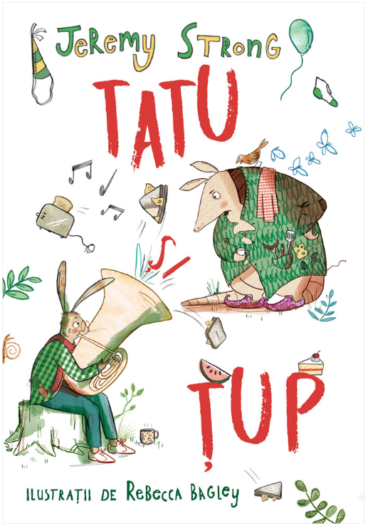 Tatu si Tup Povestioare din padurea mare de Jeremy StrongJeremy Strong a scris peste o suta de carti, vandute in mai multe milioane de exemplare in intreaga lume.Tatu si Tup locuiesc intr-o casuta din Padurea Mare. Lui Tup ii place la nebunie sa cante la o tuba care imprattie in aer briose si acadele, baloane, curcubeie si sclipici. Tatu, in schimb, se da in vant dupa sendvisurile cu branza, pe care uneori le picteaza. Cei doi se mai si ciondanesc, asa cum li se intampla chiar si celor mai buni prieteni, dar tin tare mult unul la altul si impreuna isi ajuta amicii – Pantera cu dinti ascutiti, Girafa cu picioare lungi si elegante, invizibila Insecta-Bat – sa-si vada visurile implinite.O poveste amuzanta si tandra despre prietenia dintre un tatu si un iepure, care ne dezvaluie ca, desi la suprafata suntem diferiti, avem cu totii aceleasi visuri si aceleasi dorinte.O lectura excelenta pentru cititorii la inceput de drum, care vor fi incantati de capitolele scurte si de ilustratiile nostime, numai bune de imitat si de colorat.