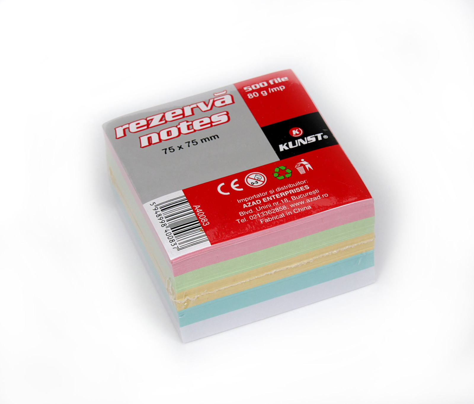 REZERVA CUB NOTES HARTIERezerva de notes adezive color - 5 culori 80 g/mp, 500 coli Dimensiune hartie: 7.5x7.5 cm