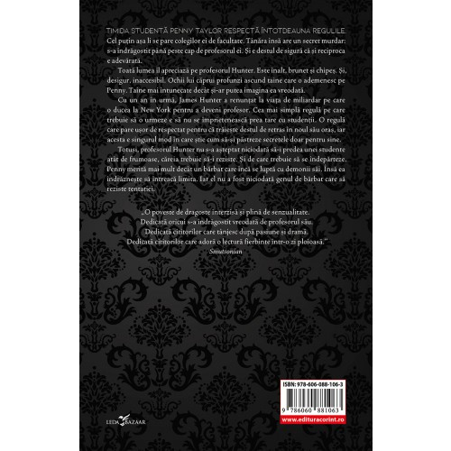 Tentatie (Primul Volum Din Seria Hunter) de Ivy SmoakTimida studenta Penny Taylor respecta intotdeauna regulile. Cel putin asa li se pare colegilor ei de facultate. Taaara insa are un secret murdar: s-a indragostit pana peste cap de profesorul ei. Si e destul de sigura ca si reciproca e adevarata.Toata lumea il apreciaza pe profesorul Hunter. Este inalt, brunet si chipes. Si, desigur, inaccesibil. Ochii lui caprui profunzi ascund taine care o ademenesc pe Penny. Taine mai intunecate decat si-ar putea imagina ea vreodata.Cu un an in urma, James Hunter a renuntat la viata de miliardar pe care o ducea la New York pentru a deveni profesor. Cea mai simpla regula pe care trebuie sa o urmeze e sa nu se imprieteneasca prea tare cu studentii. O regula care pare usor de respectat pentru ca traieste destul de retras in noul sau oras, iar acesta e singurul mod in care stie cum sa-si pastreze secretele doar pentru sine.Totusi, profesorul Hunter nu s-a asteptat niciodata sa-i predea unei studente atat de frumoase, careia trebuie sa-i reziste. Si de care trebuie sa se indeparteze. Penny merita mai mult decat un barbat care inca se lupta cu demonii sai. Insa ea indrazneste sa intreaca limita. Iar el nu a fost niciodata genul de barbat care sa reziste tentatiei"O poveste de dragoste interzisa si plina de senzualitate. Dedicata oricui s-a indragostit vreodata de profesorul sau. Dedicata cititorilor care tanjesc dupa pasiune si drama. Dedicata cititorilor care adora o lectura fierbinte intr-o zi ploioasa." Smutsonian"Profesorul Hunter frange multe inimi! Bogat, misterios, superb si inaccesibil. Pot sa inteleg cum de o fata si-ar putea pierde mintile in fata unui astfel de barbat perfect." Smutsonian"M-am indragostit nebuneste de profesorul Hunter de cum a intrat in poveste! Am adorat cuplul Penny-James si i-am tinut pumnii pe tot parcursul romanului. Imperfectiunile protagonistilor i-au facut perfecti. Conexiunea lor si tensiunea aproape ca au iesit din pagini, invaluindu-ma." Lina's Reviews"Nu ratati acest roman! I-am acordat intregii serii cinci stele. Recomand cu caldura! Ivy are un mod senzational de a scrie si de a modela fiecare personaj din povestile ei. Merita sa le cititi!" Inspired by a Book