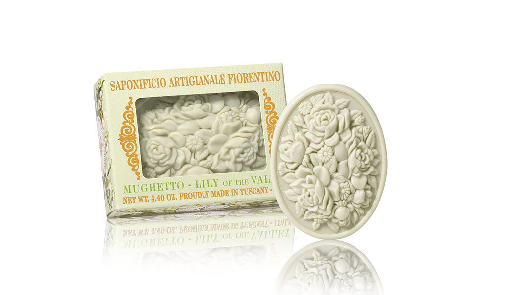 125g sapun oval cu fereastra, sculptat cu buchet de flori.