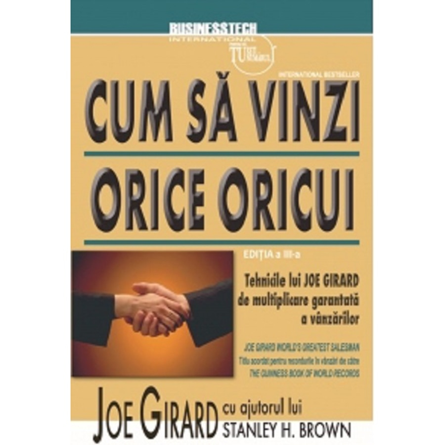 Cum sa vinzi orice oricui de Joe GirardJoe Girard este "Cel mai grozav vanzator din lume", iar cartea lui iti arata cu precizie cum poti adapta tehnicile de vanzare care l-au dus in varful ierarhiei profesiei sale.El iti spune:Cum sa-ti dezvolti un program propriu si foarte eficient de corespondenta directa;Cum iti poate imbunatati substantial rezultatele recrutarea unor "caini de vanatoare";Cum sa evaluezi dorintele, necesitatile si ceea ce isi poate permite clientul;Cum sa-l faci pe client sa aiba incredere in tine si sa te recomande altor clienti;Cum poate cinstea sa transforme un "nu" in "da";Cum sa folosesti livrarea pe loc pentru a vinde aproape orice fel de produs;Cum sa inchei o tranzactie si sa-ti faci un prieten;Cum sa transformi nemultumirea unui client intr-o comanda de achizitie;Cum sa-l faci pe un client sa-ti ramana fidel pe viata chiar dupa prima vanzare.
